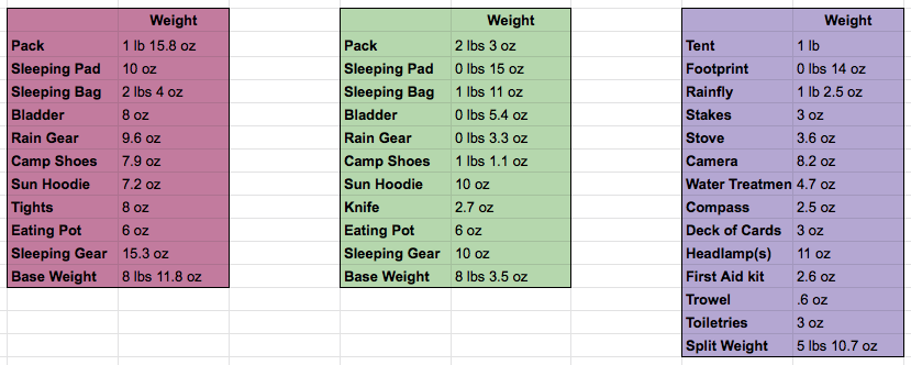 None of the weights in the above photo include our worn gear (clothing, shoes, gaiters, and poles) or any consumables (water, fuel, and food). We’ll have a post next week about our food plan for the weekend!