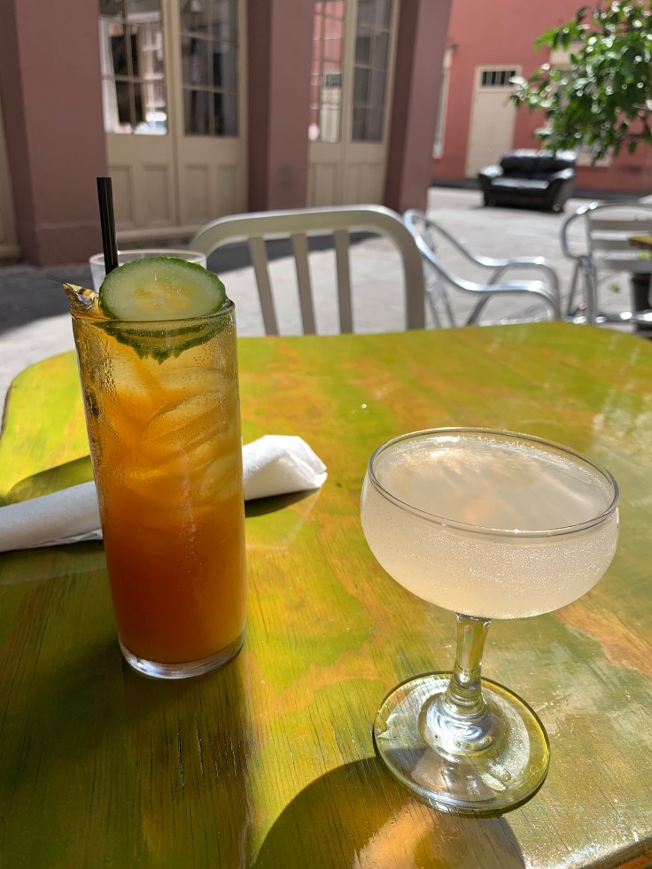 Once it started getting too hot and we started getting hungry we headed back to our B&B to mix a mimosa and cool down a bit before finding lunch. A block and a half from Bourbon street we found a restaurant tucked in an alley with outdoor only seating. It reminded Kaila of her trip to Spain and Kirk of his trip to Italy. We found the last table with a sun umbrella and quickly ordered drinks and food.