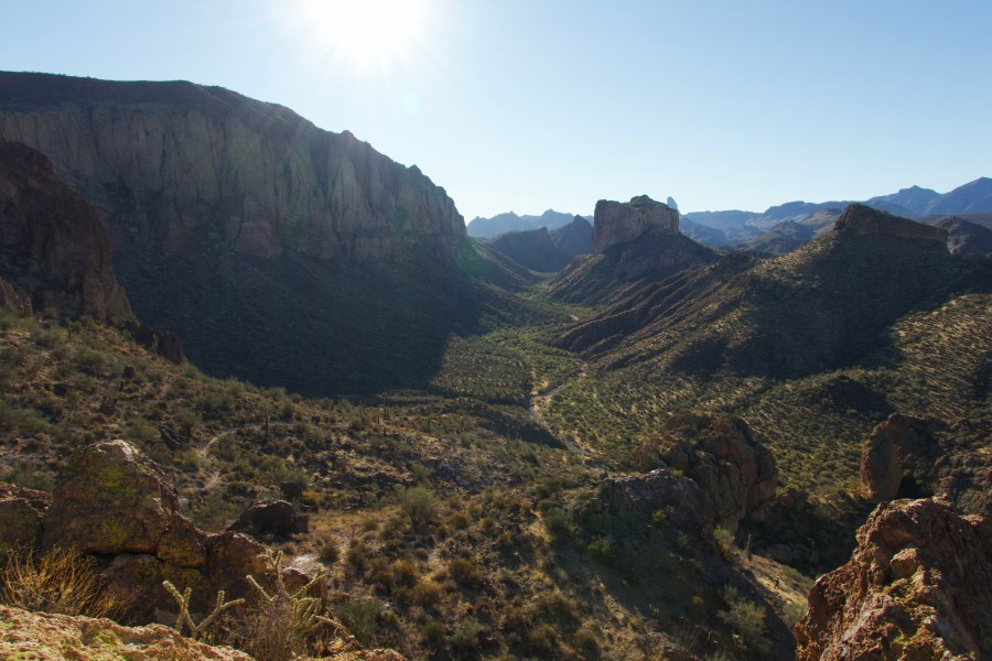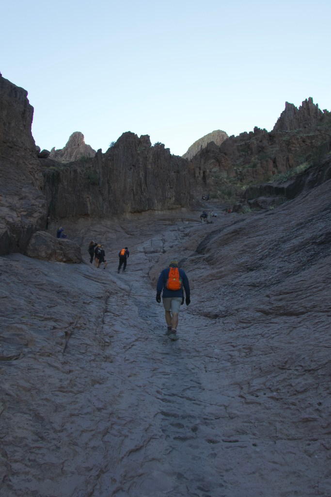 Saturday morning found us at the Boulder Canyon trail in Tonto National Forest. We had gotten up extra early to load our kayaks before heading into the National Forest. There was another group hike (in the daylight this time!) with AZ Bootleg in the Superstition Wilderness and we were thrilled. Even though it was December the forecast called for 80 degrees but standing at the trailhead I was glad I had grabbed my jacket. As soon as we hit the other side of the hill we started on it heated up and by the time we stopped for lunch at the base of Battleship Mountain I was back to my hiking dress and commenting on how warm it was for winter. The group that we hiked with was fantastic and we got to meet a couple of cute dogs, we’re excited to hike with these people in the future!